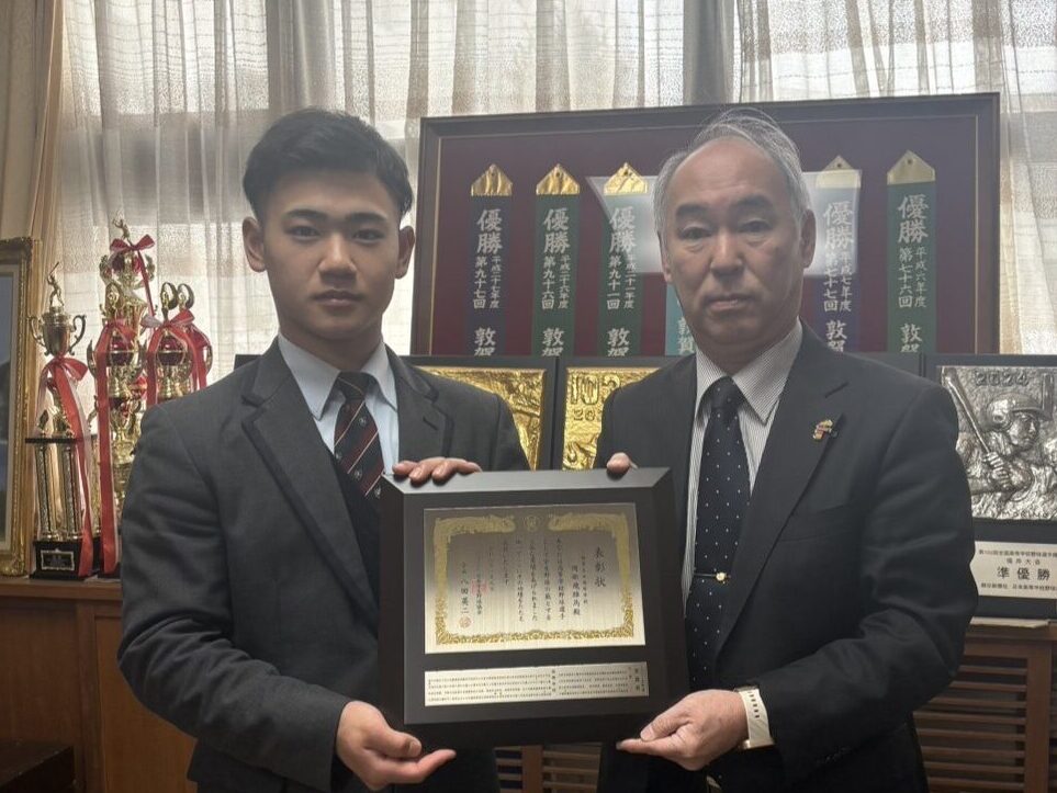 敦賀気比高校の 岡部 飛雄馬 君が選出され、1月28日に県高野連の松島会長より表彰状が授与されました。