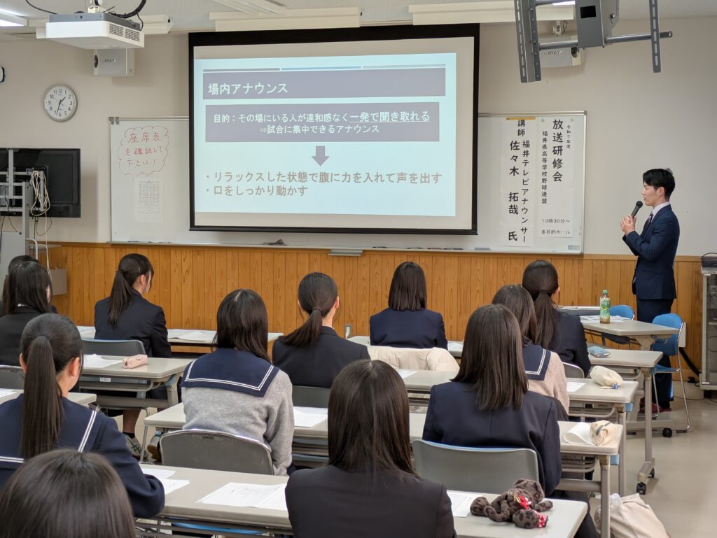 2月14日(土)に、福井テレビの佐々木拓哉アナウンサーを講師に迎え、球場内放送員講習会を実施し、各校野球部マネージャー32人が参加しました。