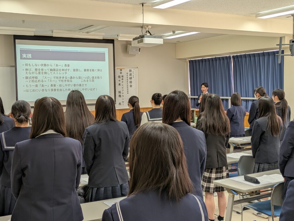 2月14日(土)に、福井テレビの佐々木拓哉アナウンサーを講師に迎え、球場内放送員講習会を実施し、各校野球部マネージャー32人が参加しました。